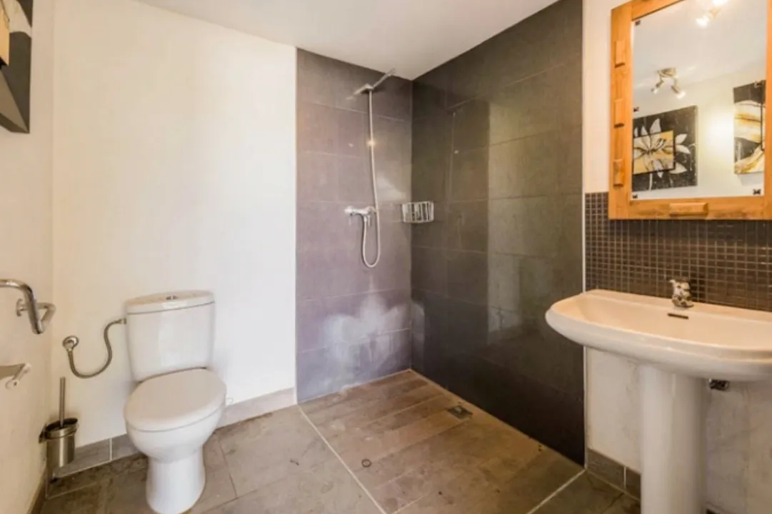 Cuenta con un amplio y luminoso salón–comedor con chimenea, creando un espacio acogedor durante todo el año. Desde el salón se accede directamente al tercer dormitorio, que también puede utilizarse como despacho, sala de trabajo o habitación de invitados.