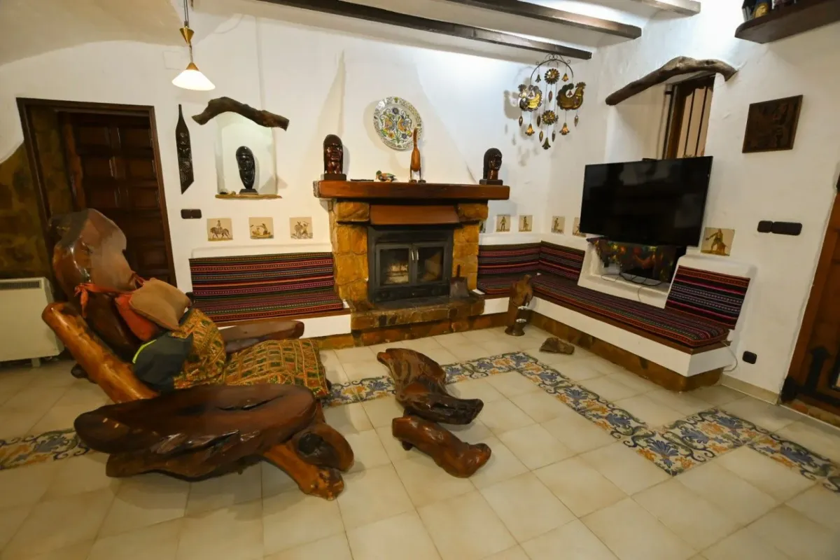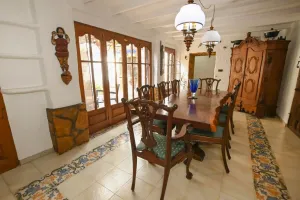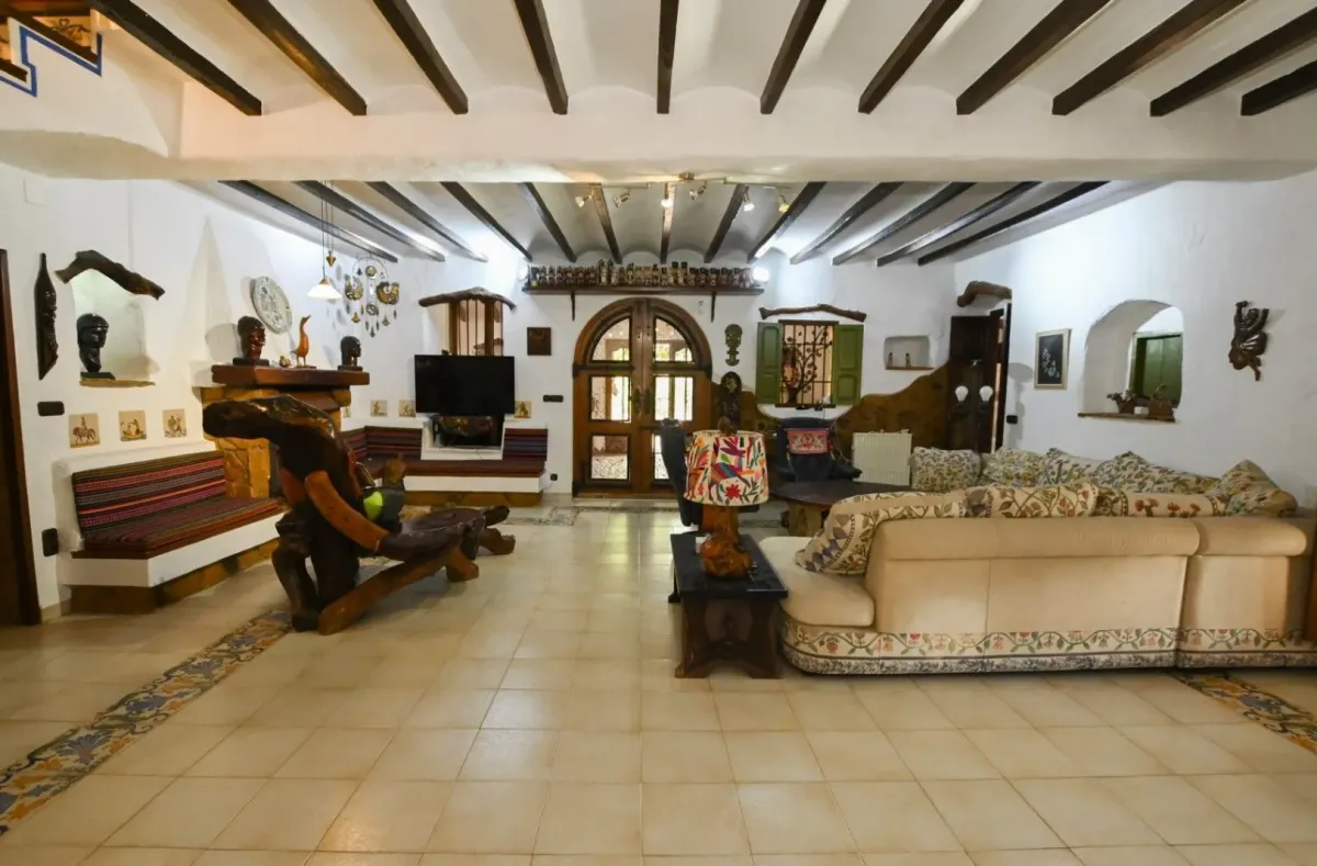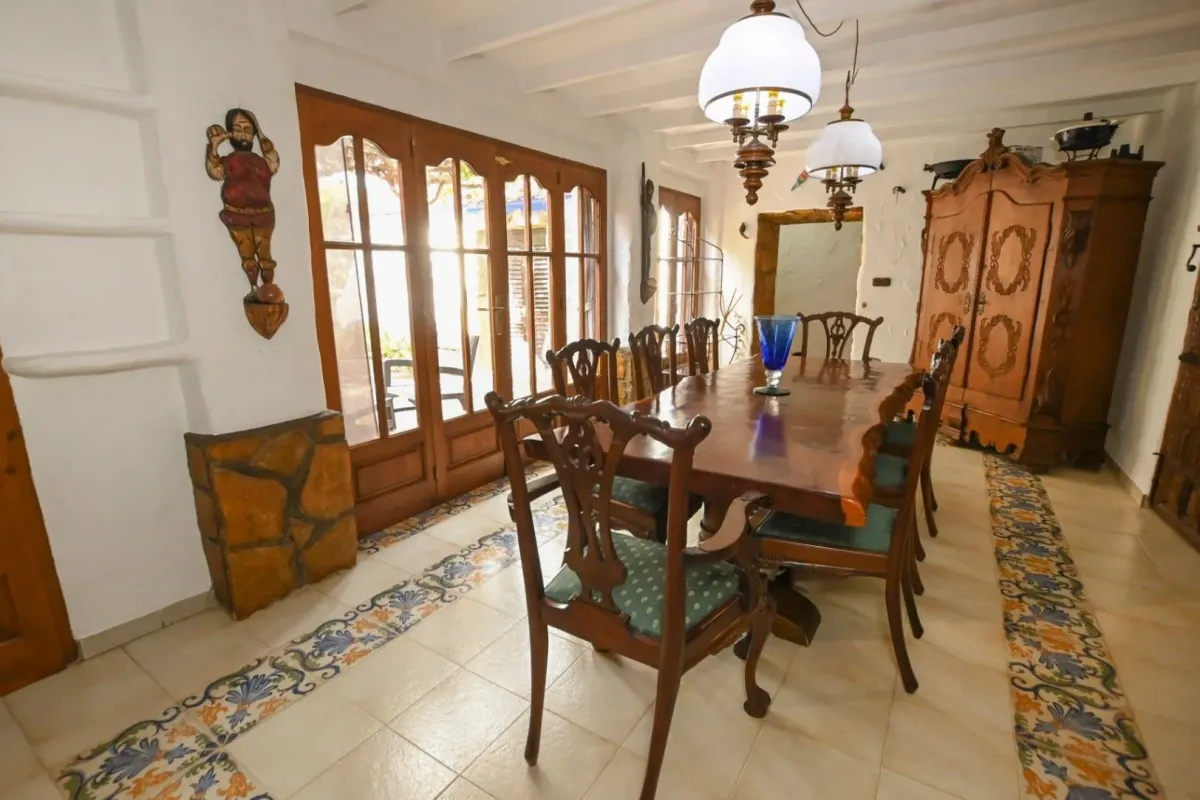Magnífica e única finca, con más de 200 años, reformada comienzos de los años 90. Tiene 450m2 útiles sobre un terreno rústico de 11.000m2. La propiedad tiene dos plantas, comunicadas por una escalera interior.Arriba: Dormitorio principal de 36m2 con aire acondicionado, tv, armarios empotrados y salida a una terraza con preciosas vistas al mar. Desde el dormitorio acceso al baño en suite con bañera, ducha, lavabo doble, WC y bidet. El baño está justo debajo del tejado, por lo que tiene una parte baja, cuidado con la cabeza.Dormitorio de 25m2 doble con aire acondicionado, salida al balcón y baño en suite con ducha, bidet, lavabo y WC.Abajo: 1 dormitorio doble con literas para niños, aire acondicionado y salida a la terraza exterior con vistas al palmeral. Baño con bañera, bidet, lavabo y WC. 1 dormitorio doble aire acondicionado y baño en suite con ducha, lavabo y WC.Salón de 49m2 con chimenea y acceso a una oficina. Habitación de juegos. Comedor principal 20m2. Cocina abierta con horno, encimera a gas, lavavajillas, microondas, y comedor con vistas a la piscina y al mar. Rincón salón al lado del comedor. Lavadero (detrás de la casa) con nevera y lavadora. Aseo.La finca está amueblada con un estilo rústico con muebles y decoración de América latina, en concreto de Bolivia, Chile y México.Exterior: Piscina (no vallada) con isla en medio, 17m x 9m de ancho ( forma irregular ), con escaleras romanas. Vistas preciosas al mar y al Peñón de Ifach. Junto a la piscina hay zona de césped con palmeras y vistas abiertas. La piscina está rodeada por una gran terraza con muebles de exterior, una barbacoa de obra, sombrilla y zona de comedor de obra.Zona de palmeras con cascada de agua, zona de césped y mesa redonda grande de obra para 8-10 personas.Parque con camino asfaltado, pinos, buganvilias, zonas de descanso y vistas abiertas hacia el mar. El jardín es un paraíso y rodea la villa. Se pueden hacer paseos entre los caminos del parque y alrededor de la finca. Zona para jugar a la petanca. Ducha exterior justo al lado de la piscina. Muros de piedra natural. Parking para varios coches (1 cubierto), trastero y un garaje. La casa tiene alarma, luces en la piscina, mosquiteras en las ventanas de los dormitorios y una caja fuerte.Situada a 1,2km del Puerto Blanco, a 2,5 km del centro de Calpe y a 3km de la playa del arenal. Supermercado a 2,5km, farmacia a 2km y restaurante más próximo a 1km. Aeropuerto de Alicante a 70 km y de Valencia a 125km.